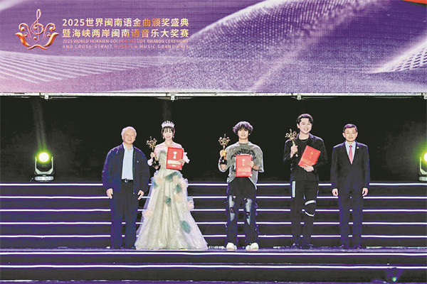 The song Let's Go won Best Arrangement at the 2025 World Hokkien Golden Melody Awards in Xiamen, Fujian province; Zhou Ke is in the center receiving the award. [Photo provided to China Daily]