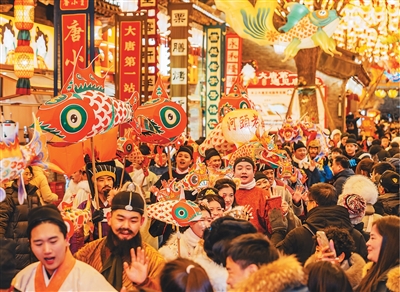 A lantern festival themed around the Tang Dynasty (618-907) and held at Hetou Old Street in Tangshan, north China's Hebei Province, drew on the dynasty's cultural legacy, with over 1,000 performances staged daily. More than 200 costumed performers carrying fish-shaped lanterns paraded through the streets, evoking the splendor of a Tang Dynasty lantern festival.