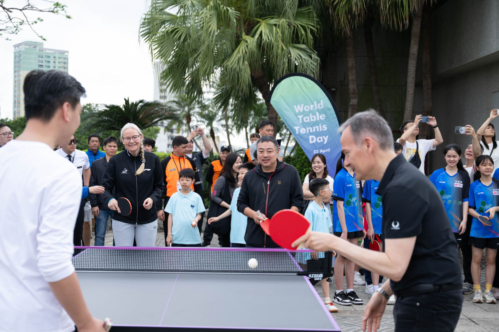 2025年4月20日,“国球进公园”暨庆祝2025年世界乒乓球日活动在澳门大炮台公园举行。图为佩特拉·索林(后左)与刘国梁(后右)在活动中。新华社发(张金加 摄)