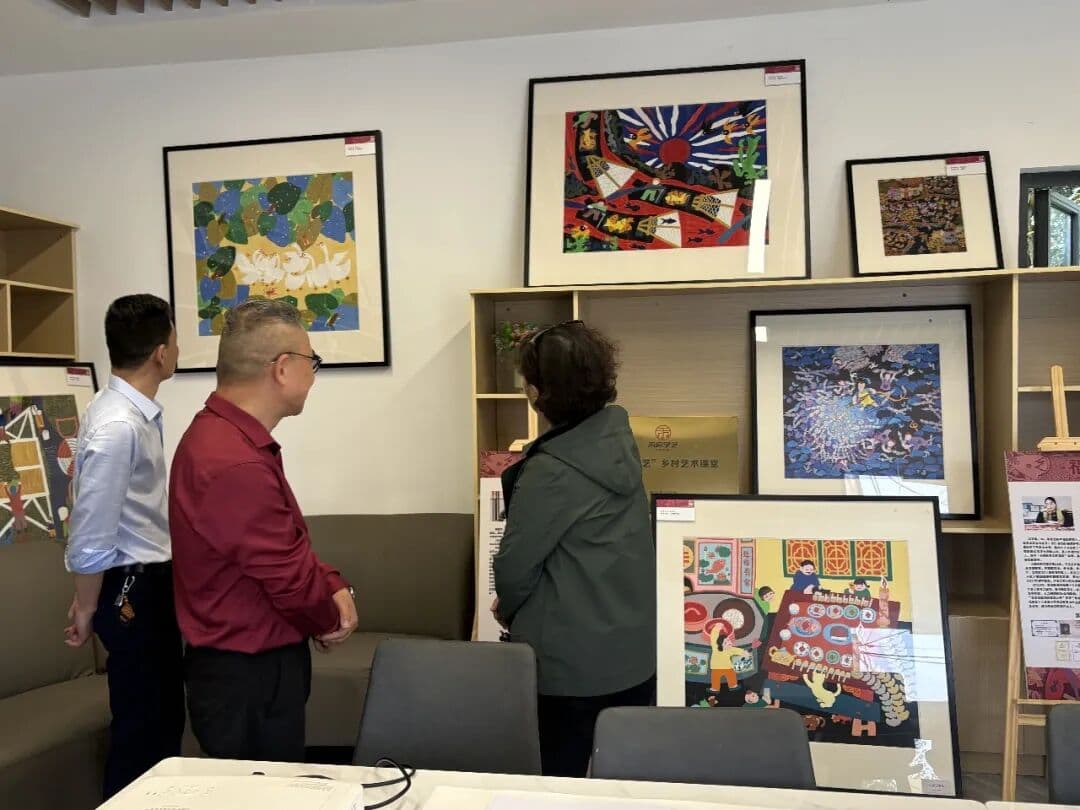 · 叶梅(右)在采访期间了解农民画。(受访者供图)