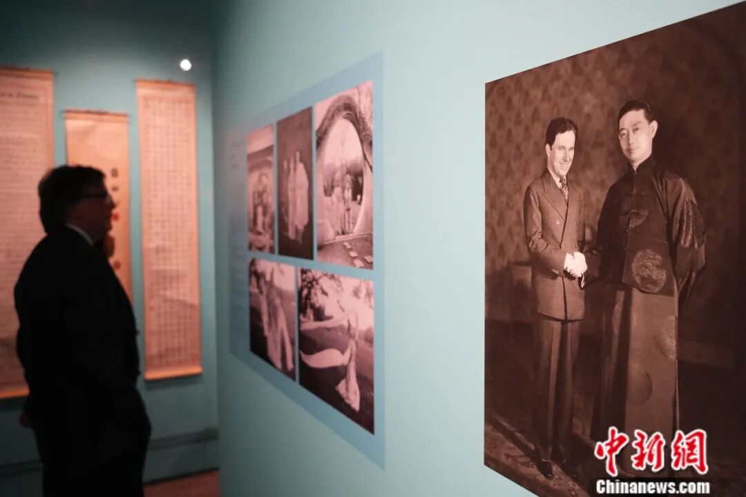 当地时间2026年3月11日,美国华美协进社中国美术馆和中国艺术研究院在纽约推出“飞翼歌舞:梅兰芳访美演出”展览。图为1917年梅兰芳《天女散花》戏服肖像照片等展品。中新社记者 廖攀 摄