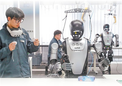 青岛人形机器人数据采集训练场,青年数据采集师指导机器人进行日用品的分拣。 张进刚摄(人民视觉)