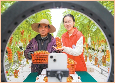 江苏南通通州区十总镇,青年党员志愿者帮助农民直播销售小番茄,助力增收。 翟伟凯摄(人民视觉)
