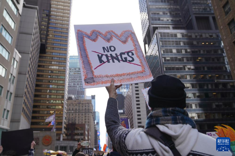 ·2026年3月28日,美国纽约,抗议者手举“不要国王”标语牌。 (新华社/张凤国摄)