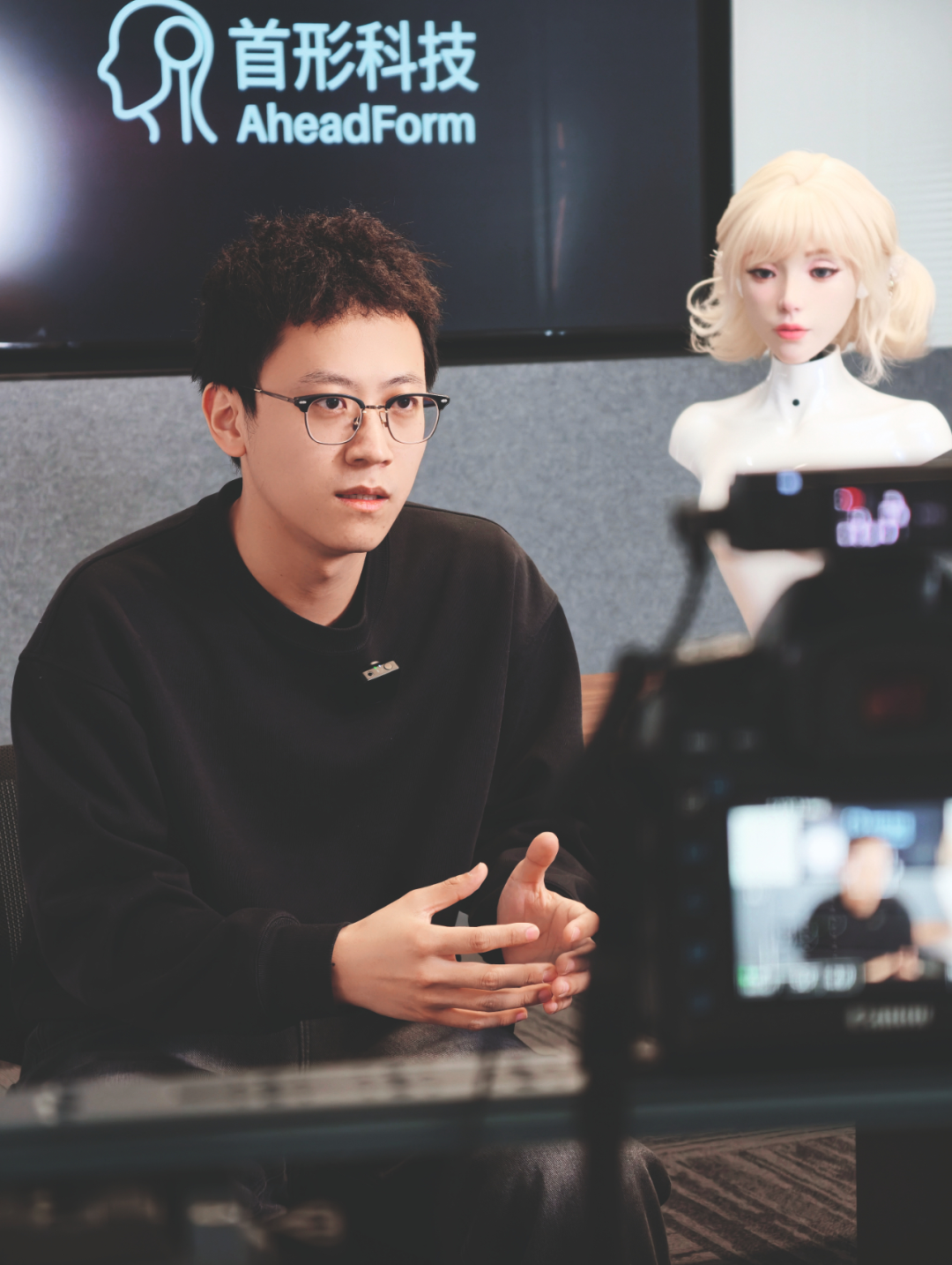 在视频发布的第二天,环球人物记者在北京亦庄锋创科技园见到了U航。他本名胡宇航,是新创企业首形科技创始人、首席执行官。接受采访时,胡宇航特意将视频中的机器人搬到了接受采访的会议室,还特意走到摄像机的取景器前,以观察机器人的镜头呈现效果。“头稍微低一点,直视镜头、眼睛不动会让观众不舒服。嘴角再抬起来一点,上镜更好看。”他一边说一边指挥技术人员进行调整。