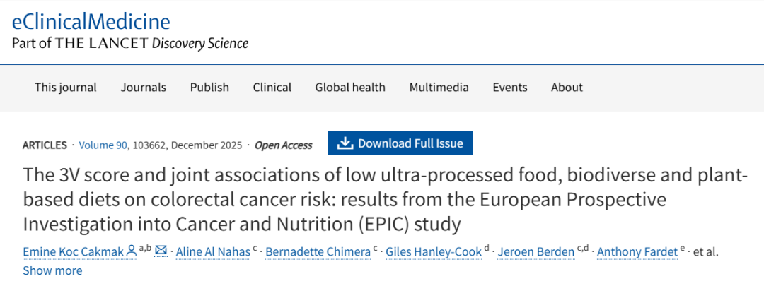 [3]Koc Cakmak E, Al Nahas A, Chimera B et al.The 3V score and joint associations of low ultra-processed food, biodiverse and plant-based diets on colorectal cancer risk: results from the European Prospective Investigation into Cancer and Nutrition (EPIC) study eClinicalMedicine, 2025; 90