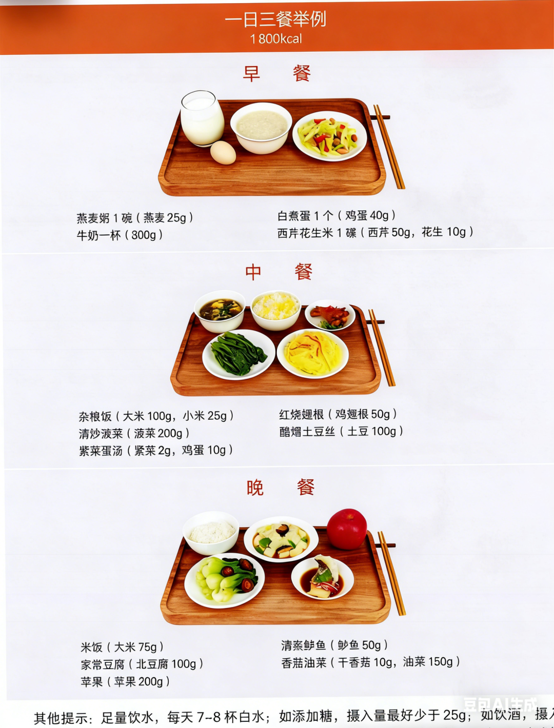 最后,附上《中国居民膳食指南(2022版)》女性一天1800Kcal的食谱示范,可作日常饮食的参考。