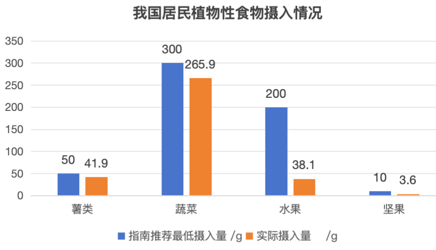 根据我国农业农村部 2023 年发布的《我国居民植物性食物消费变化及其膳食营养贡献研究报告(简)》相关数据[8],我们每天吃的大多数植物性食物,摄入量达不到膳食指南推荐的最低值。与此同时,动物性食物摄入持续上升,整体饮食结构逐渐偏向“高脂肪、低纤维”。