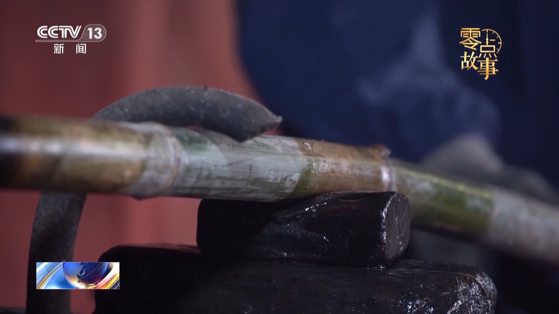 陈粉年用火烤让毛竹变软后,她的丈夫王正祥立即接手,用力将毛竹压直,动作要精准有力,他同时在毛竹压直处泼冷水冷却,起到迅速定型的效果。