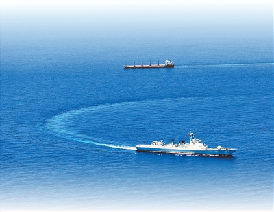 中国海军第四十六批护航编队焦作舰(前)护送货船至解护点后与之分航。