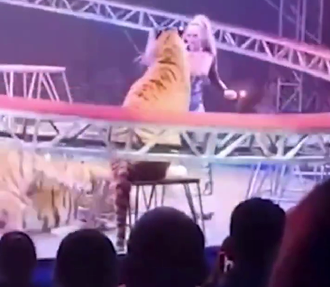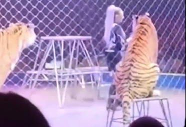 马戏团上演“掠食者吸引力”节目期间,3只老虎在舞台中央完成高难度表演动作,环绕表演区的防护安全网突然出现故障并坠落。3只老虎受到惊吓,其中一只趁机翻过低矮围栏,直接闯入座无虚席的观众席。