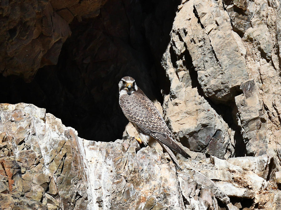 A rare saker falcon is spotted and recorded on April 3 at the rocky cliffs of the Barluk Mountains in Tuoli county of Tacheng prefecture, Xinjiang Uygur autonomous region. [Photo by Chang Dianxue / for chinadaily.com.cn]