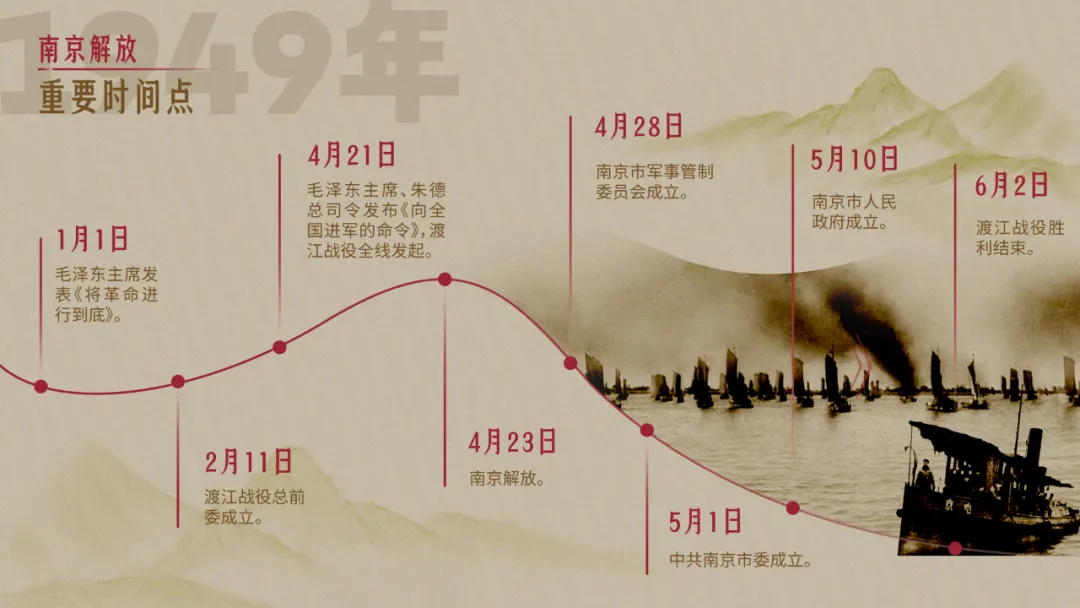 “今天上午中国人民解放军已经进入市区,南京这座被国民党政府统治了22年的古城,获得了新生,南京解放了!”