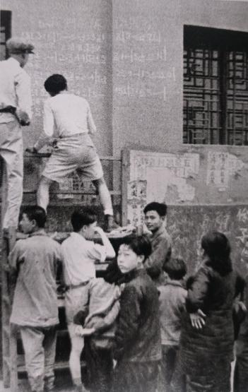 南京学生在墙上书写欢迎人民解放军的歌曲。