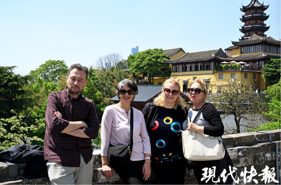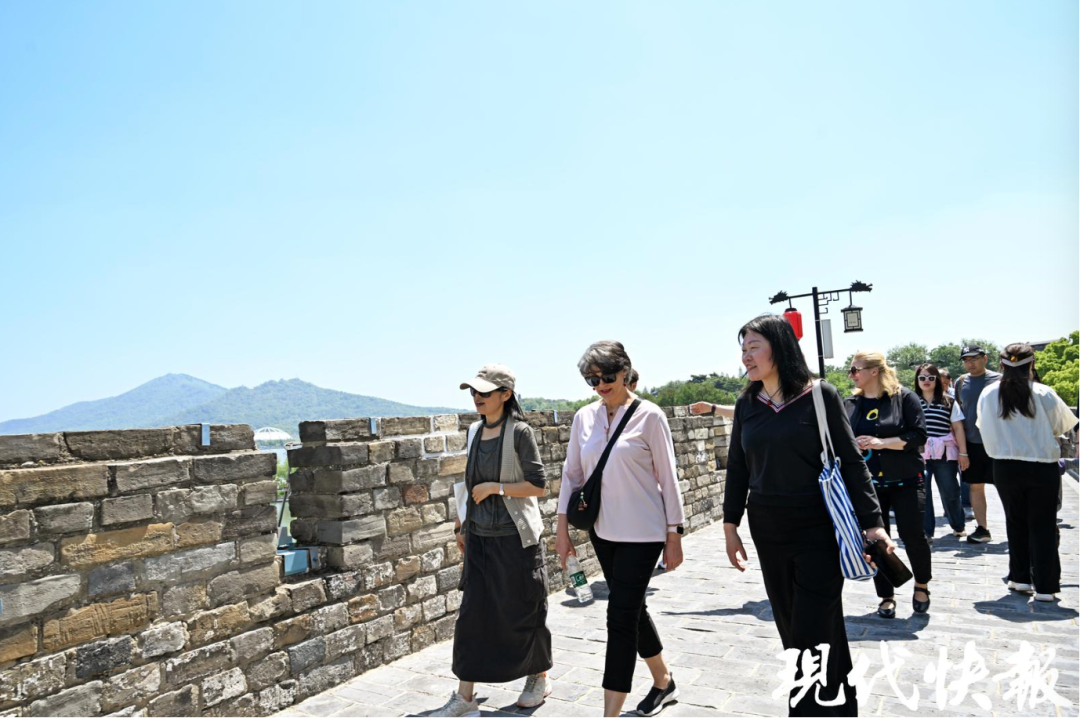 “南京城墙是遗存至今的中国明代都城城墙,始筑于公元1366年……”南京城墙台城讲解员周浠彤在城墙脚下向汉学家们介绍南京城墙的悠久历史。随后,一行人登上城墙,沿着城墙一路参观。走在明城墙上,一侧是波光粼粼的玄武湖,另一侧是金墙古刹与绿荫相得益彰,加拿大汉学家赞叹说:“这里的景色非常可以!”大家摆出姿势,让现场的记者为他们“出片”。“一定要同时拍到鸡鸣寺和紫金大厦!”墨西哥汉学家莉亚娜笑着叮嘱。
