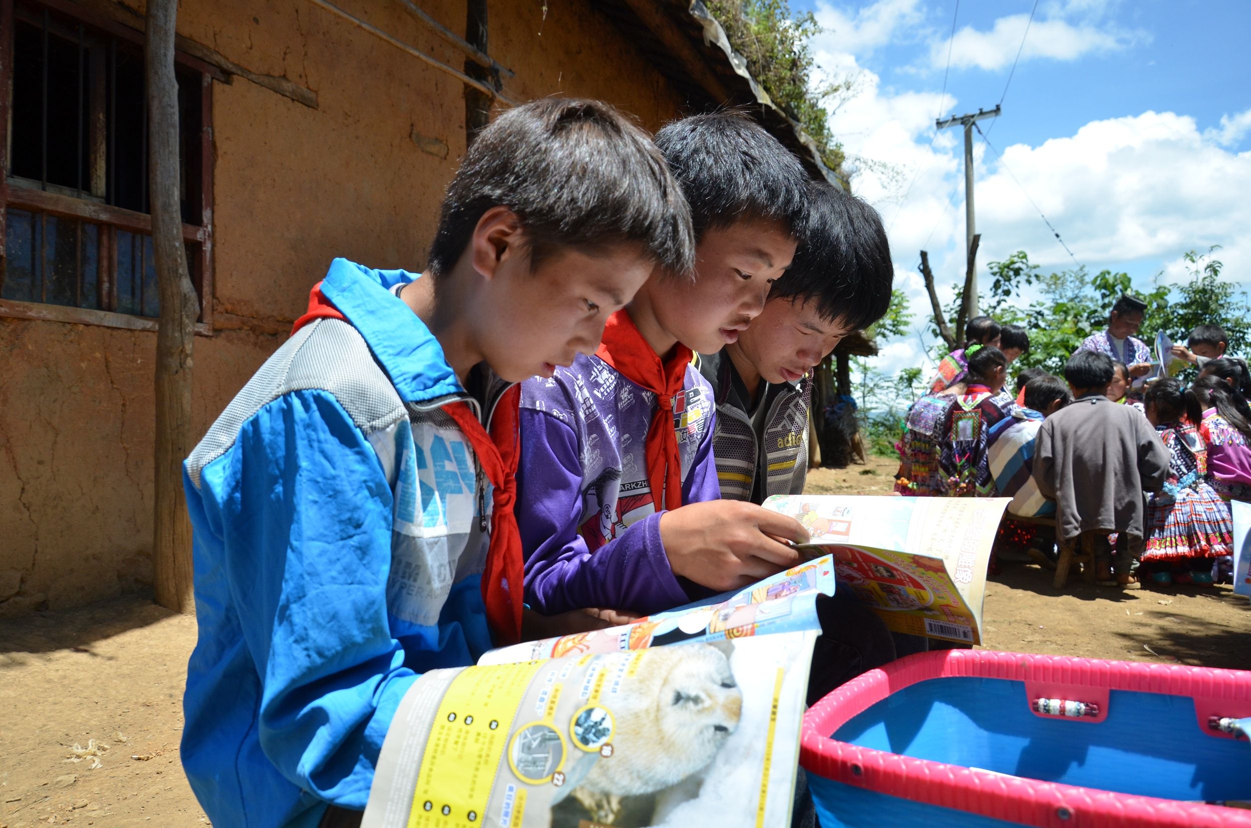 村寨里的小朋友们阅读“背篼图书馆”带来的书籍。大关县文化和旅游局供图