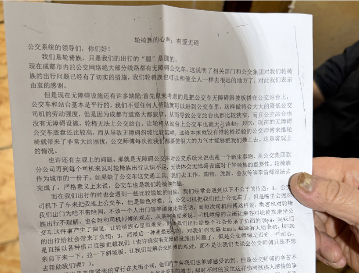 这根筷子后来敲出了《小小的我》的电影名场面——投诉公交车司机。2015年,龚苏遭遇公交车拒载。他没有选择沉默,用筷子敲出一封很长的投诉信寄给相关部门,信的第一句已经开始像诗歌表达:“我们是轮椅族,只是我们出行的‘腿’是圆的。”