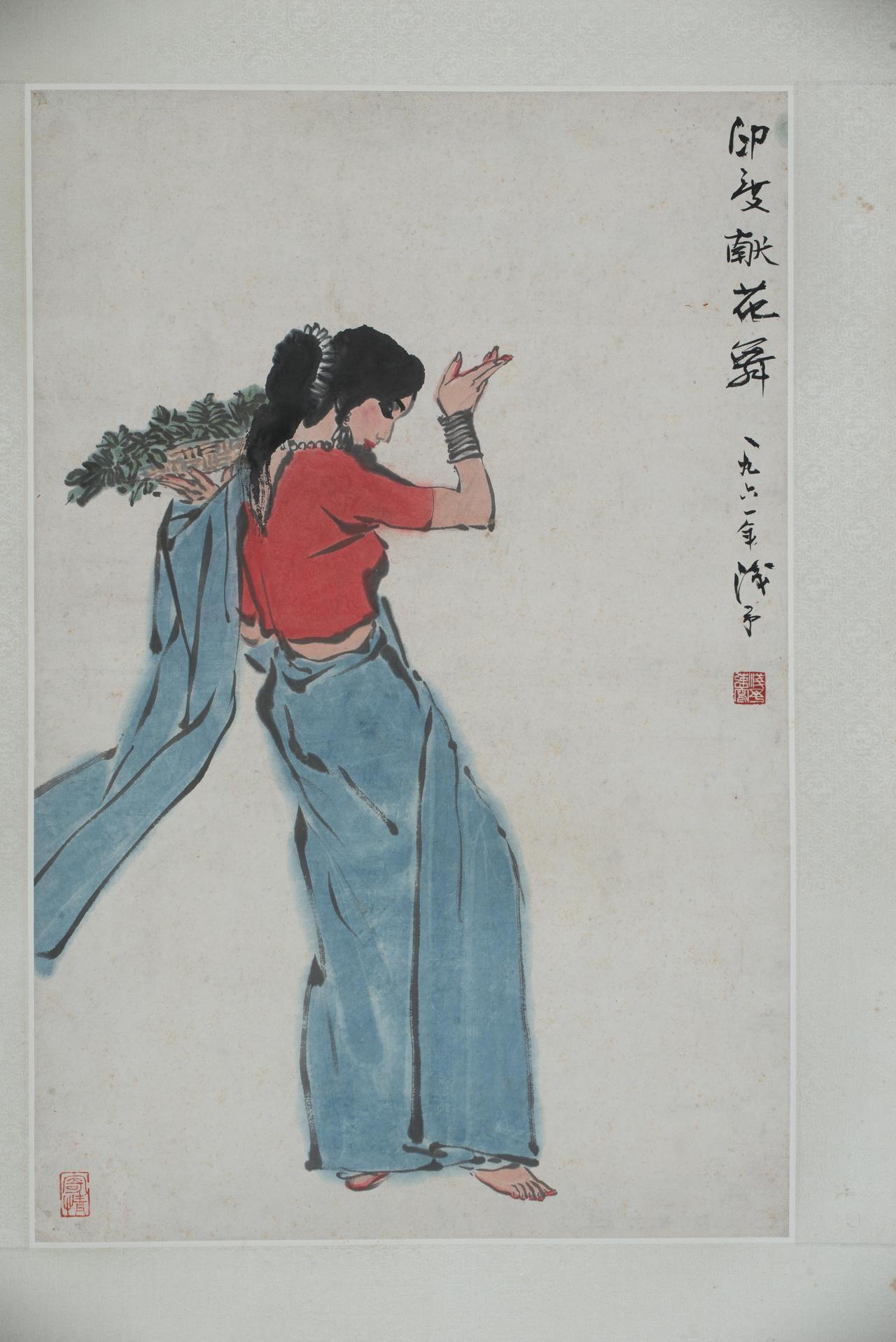 许多观众对他的《印度献花舞》赞叹不已。画中舞者托举花枝的手,拇指与食指相扣,既显虔诚又含韵律。画作在水墨、色彩等方面传承了中国绘画传统技法,同时创造性地把速写植入人物形象塑造,简而不空,形真神足。