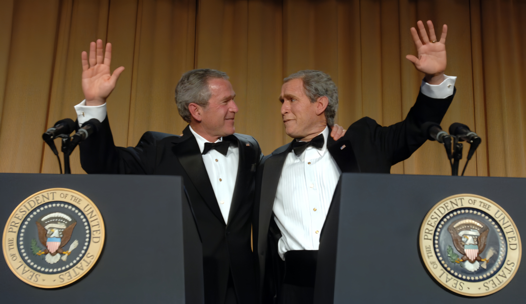 ·2006年,时任美国总统乔治·布什(左)与扮演他的戏剧演员史蒂文·布瑞吉合影。(美国有线电视新闻网)