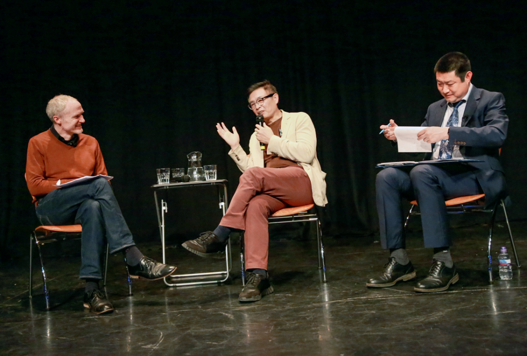 ·2025年4月,麦家(中)在英国爱丁堡大学做文学交流。(受访者供图)