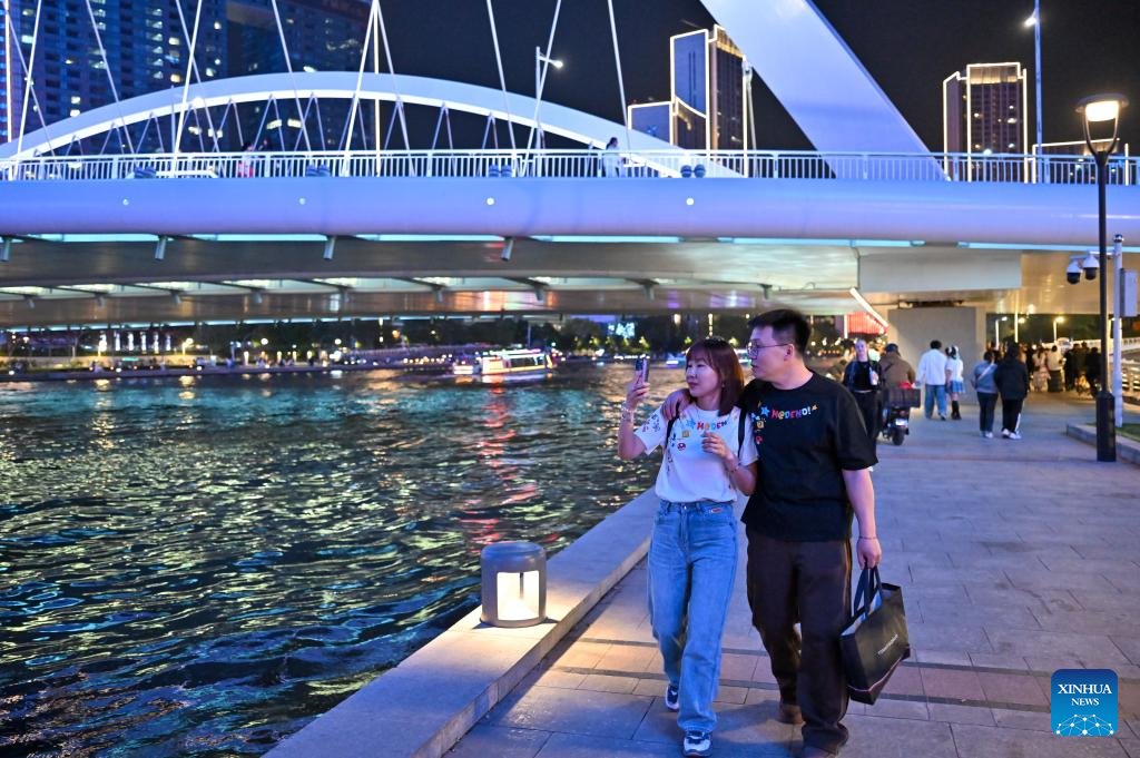 Tourists stroll alongside the Haihe River at night in Tianjin, north China, April 24, 2026. In recent years, Tianjin has become a popular tourist destination, as the city keeps enriching its nighttime experience by expanding tourism scenarios and diversifying business formats. (Xinhua/Sun Fanyue)