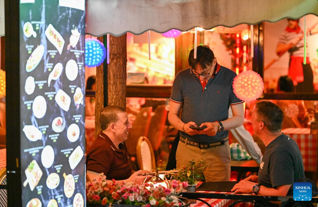 Foreign tourists order food at a restaurant in the Italian Style Area of Tianjin, north China, April 24, 2026. In recent years, Tianjin has become a popular tourist destination, as the city keeps enriching its nighttime experience by expanding tourism scenarios and diversifying business formats. (Xinhua/Sun Fanyue)