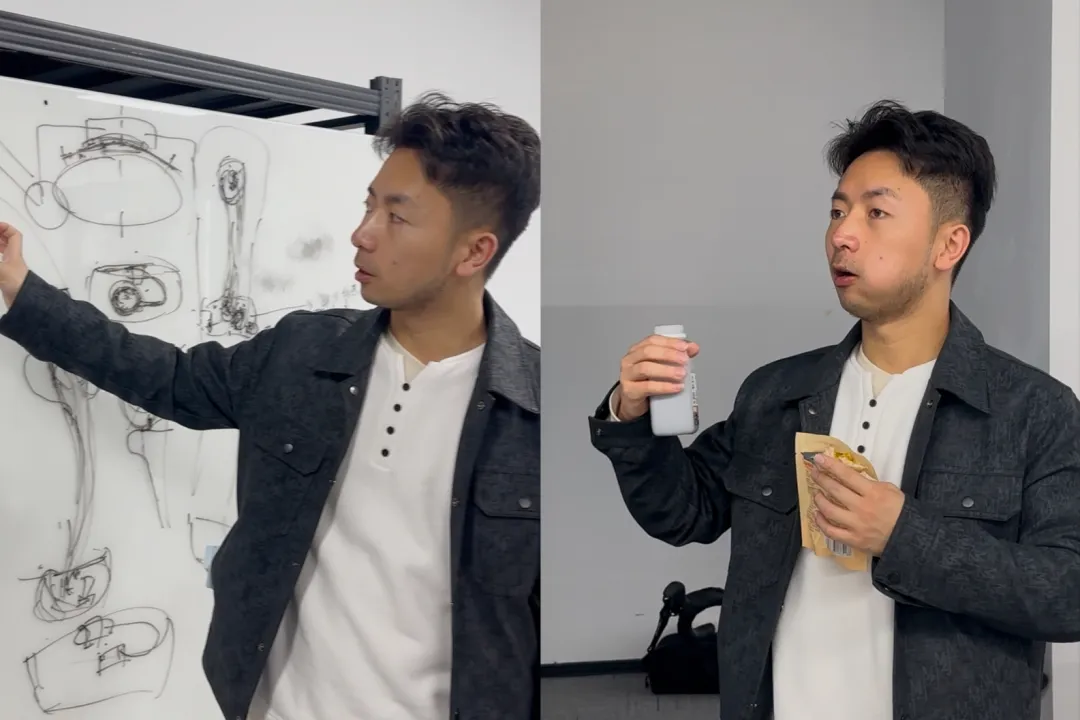 一见面,他就给我们展示起了最得意的实验室:一台未完成的半身外骨骼机甲立在中央,白板上,设计图稿密密麻麻。实验室的角落里,摆着一张钢架床,床下则是整箱的泡面。