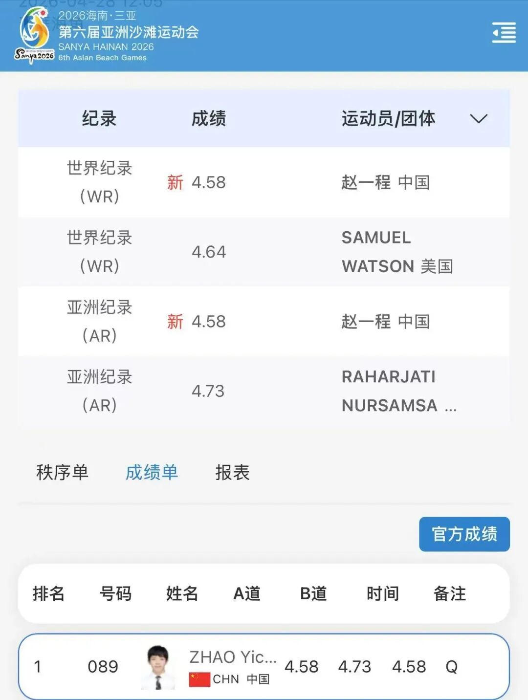 据央视新闻,在刚刚结束的亚沙会男子速度攀岩预赛中,中国选手赵一程以4秒58的成绩创造该项目世界纪录。原纪录是由美国选手沃森在2025年攀岩世界杯巴厘岛站中创造的4秒64。
