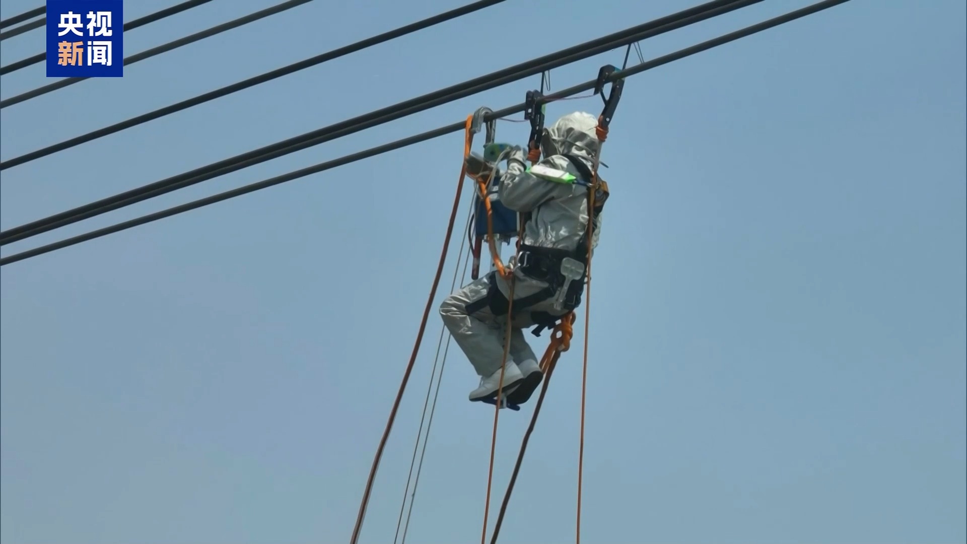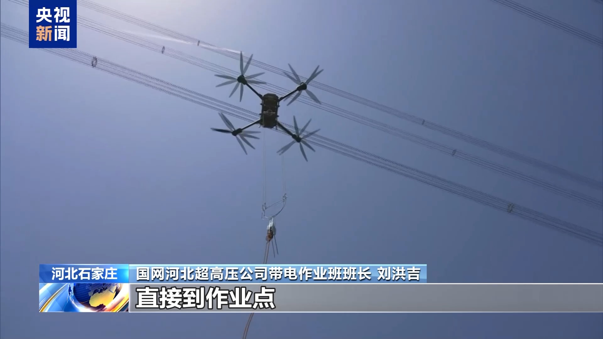 国网河北超高压公司带电作业班班长 刘洪吉:我们作业点的高度大概是81米,按3米一层算,大概27层楼。用的作业方式就是“小飞人”,一会儿我们用无人机,将两个挂钩和绳索挂到作业点上,一会儿我要乘坐电动升降装置直接到作业点。